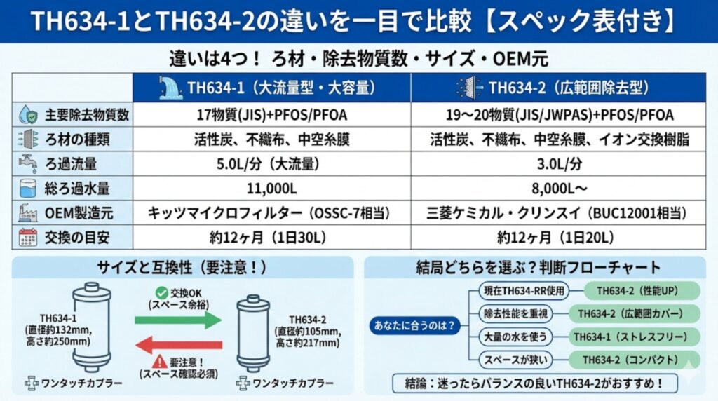 この記事では、TOTO公式パーツセンターや三菱ケミカル・クリンスイの一次情報を徹底的に調査し、TH634-1とTH634-2の違いをスペック表つきでわかりやすく整理しました。