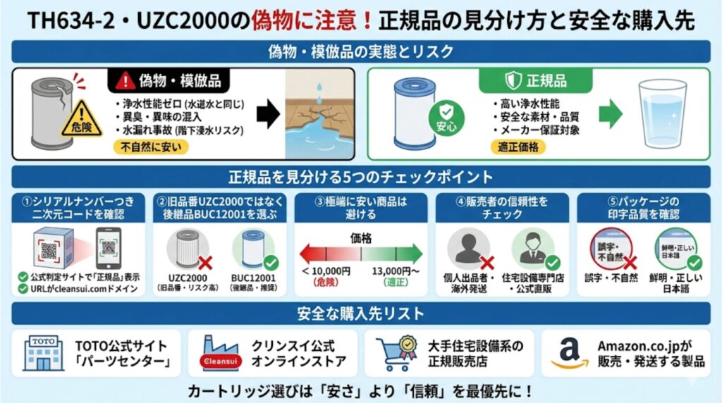 ③ ただし偽物対策は絶対に怠らない 模倣品は見た目では判別がむずかしく、浸水被害や健康リスクに直結します。公式ショップや実績のある住宅設備専門店から購入することが、「もっとも安く、もっとも安全に」浄水器を維持する唯一の方法です。