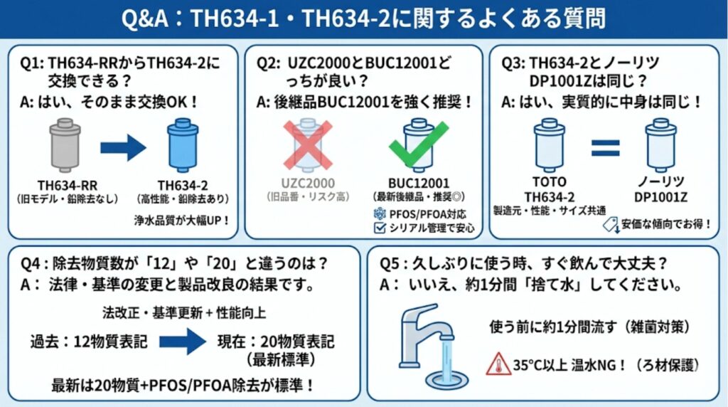 A: はい、そのまま交換できます。TH634-RRは製造終了した旧モデルで、鉛除去能力がありません。接続口とサイズが共通なので、TH634-2に交換すれば鉛やトリハロメタンの除去が加わり、浄水品質が大幅にアップします。